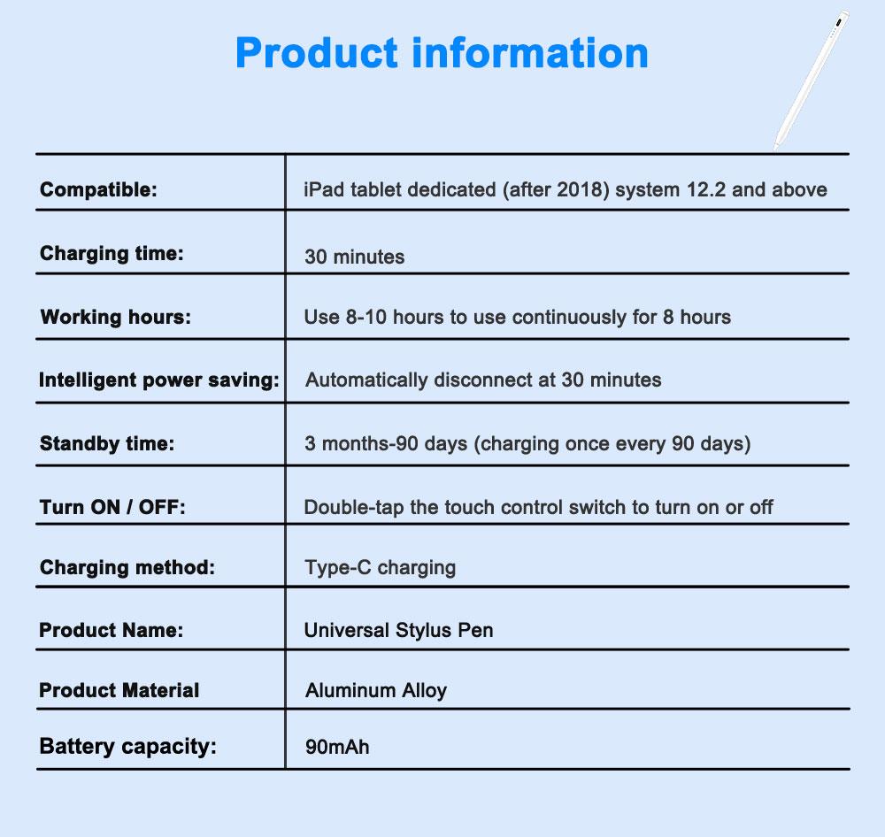 The side of the pencil contains magnets, which can be attached to the side of the ipad that partially supports magnetic absorption charging, so that it can be carried at any time to prevent loss(Please note that this pencil does not support magnetic charging)